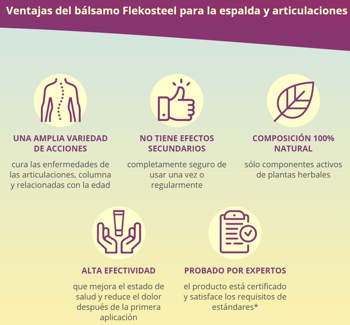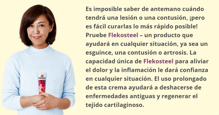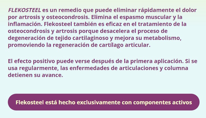 ¿Qué es Flekosteel? Flekosteel – Una gran solución para la artritis y el dolor de espalda. Este es un producto que puede aliviar el dolor causado por diversas enfermedades, como la artritis y el dolor de espalda. Alivia la tensión muscular y la inflamación. Flekosteel – está destinado al tratamiento externo del dolor e inflamación articular. Está comprobado que Flekosteel: